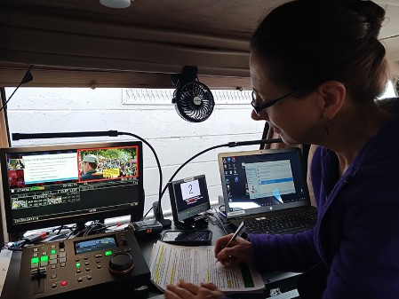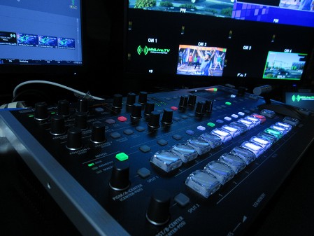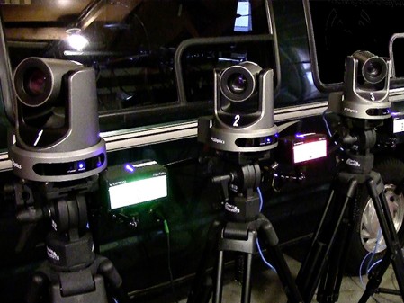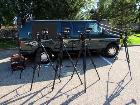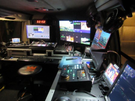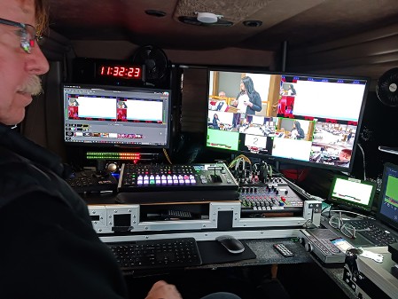Four Panasonic AG-AC90 HD Cameras with SDI cable runs; crewed with staff cam ops • Four PTZ Optics Pan-Tilt-Zoom robotic HD Cameras on single POE CAT-6 cables and fiber optic cable; controlled by Technical Director using the PTZ Optics Superjoy controller in the van • Two Go-Pro Hero 9's • Cerevo FlexTally Wireless Tally Light System • Roland V-160HD/4K 10-input switcher with four PIP's (picture in picture), two DSK's (downstream keyers) and Chroma Key • Roland P-20HD Instant Replay & Slow Motion playback device with Wacom "Telestrator" drawing tablet • Dell PC with CG (Character Generator) for on-screen graphics, lower 3rds & PowerPoint slideshows • A second Dell PC with video editing (for breaking news on-location) & Video Playback of preproduced videos and PowerPoint slideshows • Blackmagic HyperDeck Studio HD Mini recorder for backup recordings of live-stream broadcast; can record switcher-assigned outputs, such as "clean feed" (no graphics) • Behringer 8-channel audio mixer and snake • Four Audio Technica wireless lav mics and two wireless handheld mics • Four Samson wireless headset mics and eight Shure SM57 wired mics • Assorted mic stands and booms • Baotung IFB earpiece coms (communication with talent) • LiveU™ HDMI/SDI Solo Pro wireless video transmitter (from the van to CDN social media, websites, and broadcast television) • Restream.io multistream web hub (transmitting the video program from LiveU™ to multiple destinations simultaneously, i.e., YouTube, Facebook, X, and websites) • Verizon MiFi 5G Hotspot (for Internet & email access) • Hollyland Mars 400S Pro HDMI video transmission system • Cinegears Ghost-Eye 600M video transmission system (both Hollyland and Cinegears are used for wireless/traveling HD camera up to 1,000 feet LOS (line of sight) from the van •