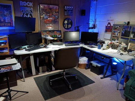Panasonic AG-UX180 4K Cameras, grip and audio mic gear • Teleprompter • Adobe Creative Cloud editing software package: Premiere Pro, After Effects, Audition, Media Encoder and Photoshop • Two Dell XPS 8930 Core i7's with 32GB RAM and NVIDIA GTX 1660 Ti 6GB graphics card • Sony Sound Forge DAW • Audacity DAW • Mixcraft Pro Studio Sound Design & DAW in conjunction with an Alesis Q49 MIDI keyboard • Two AC/DC LED Light Sticks • Eight RGB AC/DC LED Light Panels • Three Arri LED Studio Fresnel lights and stands • Four Impact Qualite 300 Watt Tungsten lights • Various chromakey green screen, black screen and white screen background assemblies (stage and portable) • Various camera tripods and jibs • Various lighting tripods and C-Stands • Stock footage supplier: Storyblocks.com • AI V/O personalities: Eleven Labs • Three bags of Brach's French Burnt Peanuts